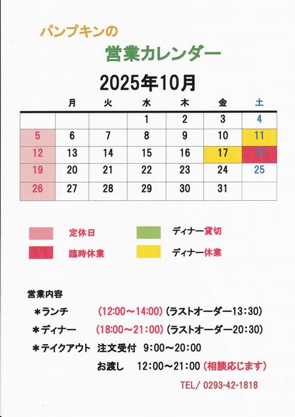 | ▼パンプキンの10月のカレンダー |
