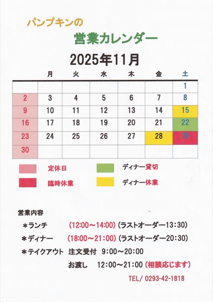 | ▼パンプキンの11月のカレンダー |
