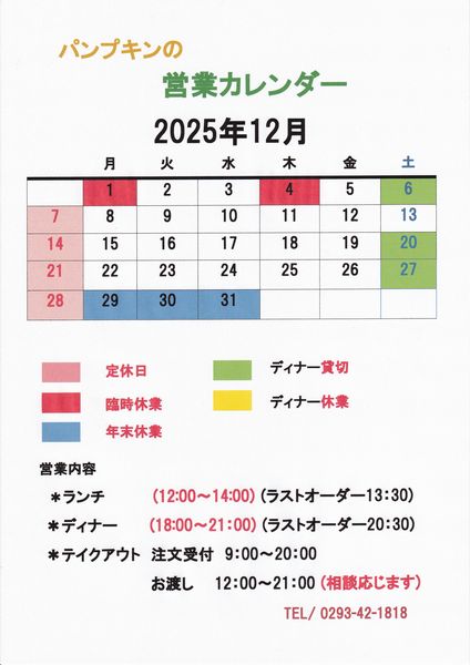 | ▼パンプキンの12月のカレンダー |